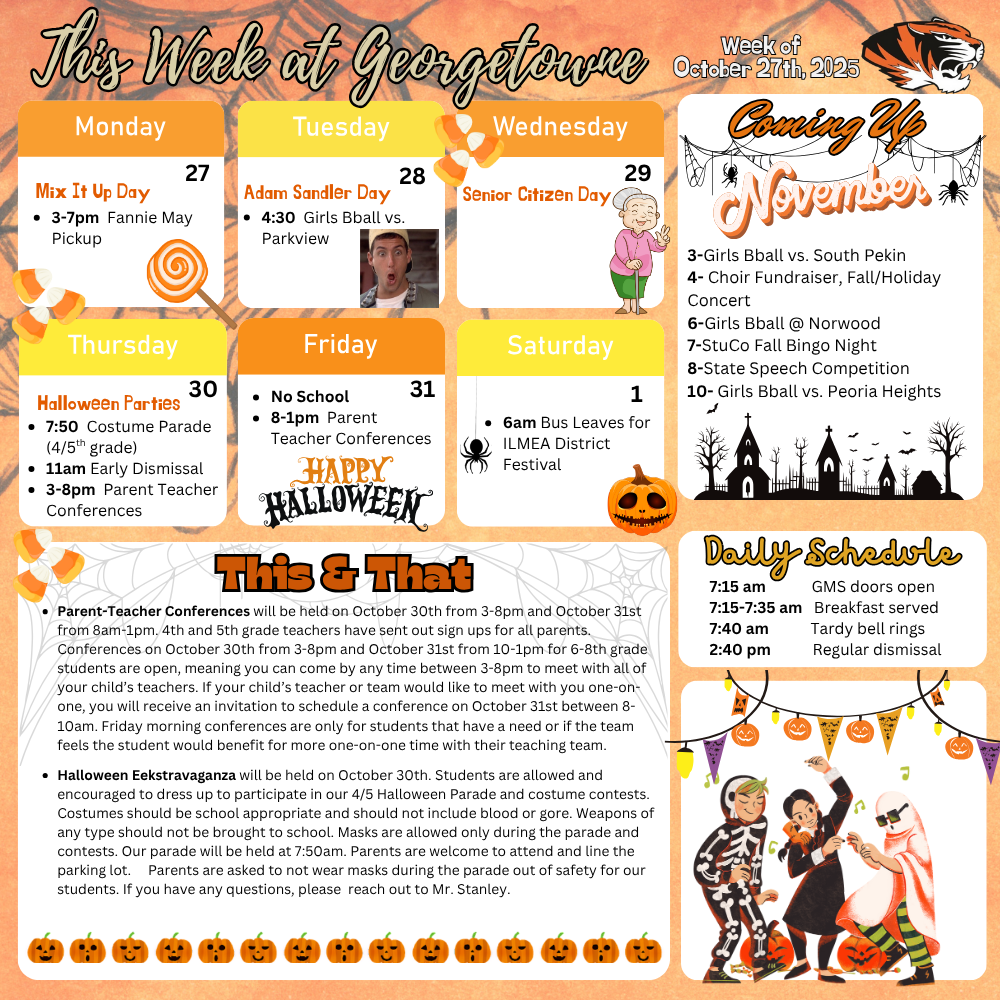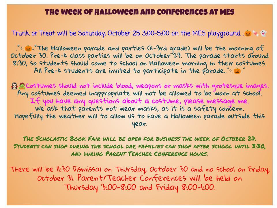 It is a BIG and BUSY week in District 102! Below you will find info for Halloween celebrations and P/T Conferences for both MES and GMS. We can't wait so see your creative costumes and meet with parents to kick off a wonderful Halloween weekend!