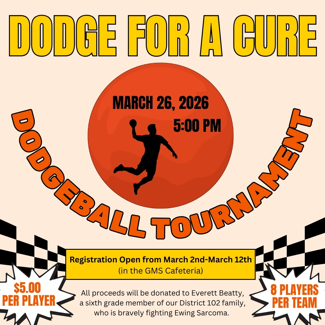 - GMS Student Council is proud to announce "Dodge for a Cure," a dodgeball tournament which will raise money for Everett Beatty, a sixth grade member of our District 102 family, who is bravely fighting Ewing Sarcoma. The tournament will take place on March 26th. The cost is $5.00 per player and each player must register as part of an eight-member team. For more information and to sign-up, please visit the Student Council table at lunch from March 2nd through March 12th!