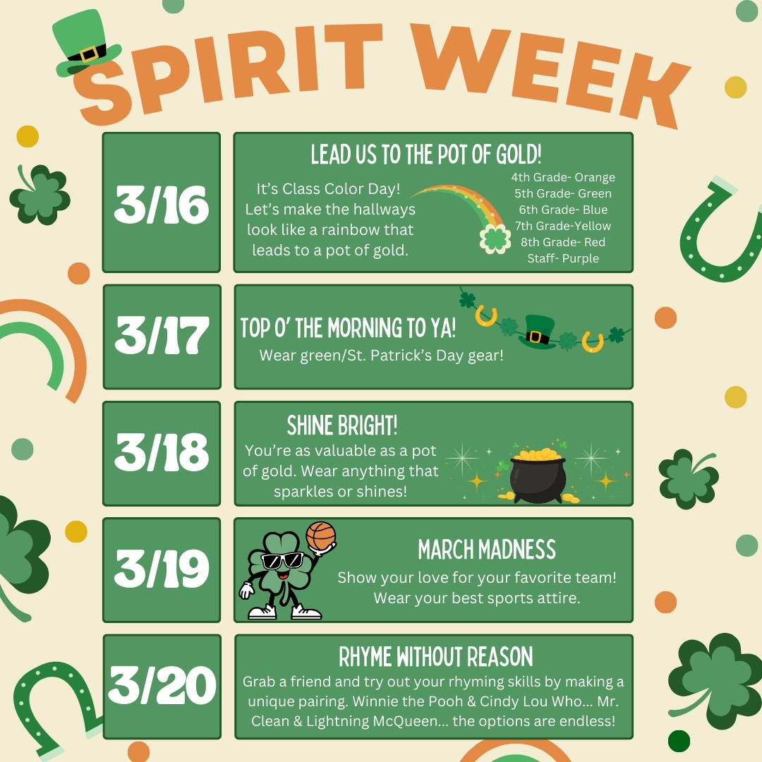 - Student Council will be hosting our next spirit week of the year from March 16-March 20. Remember, students and teachers who participate will be showing school spirit AND working toward earning rewards for their class.