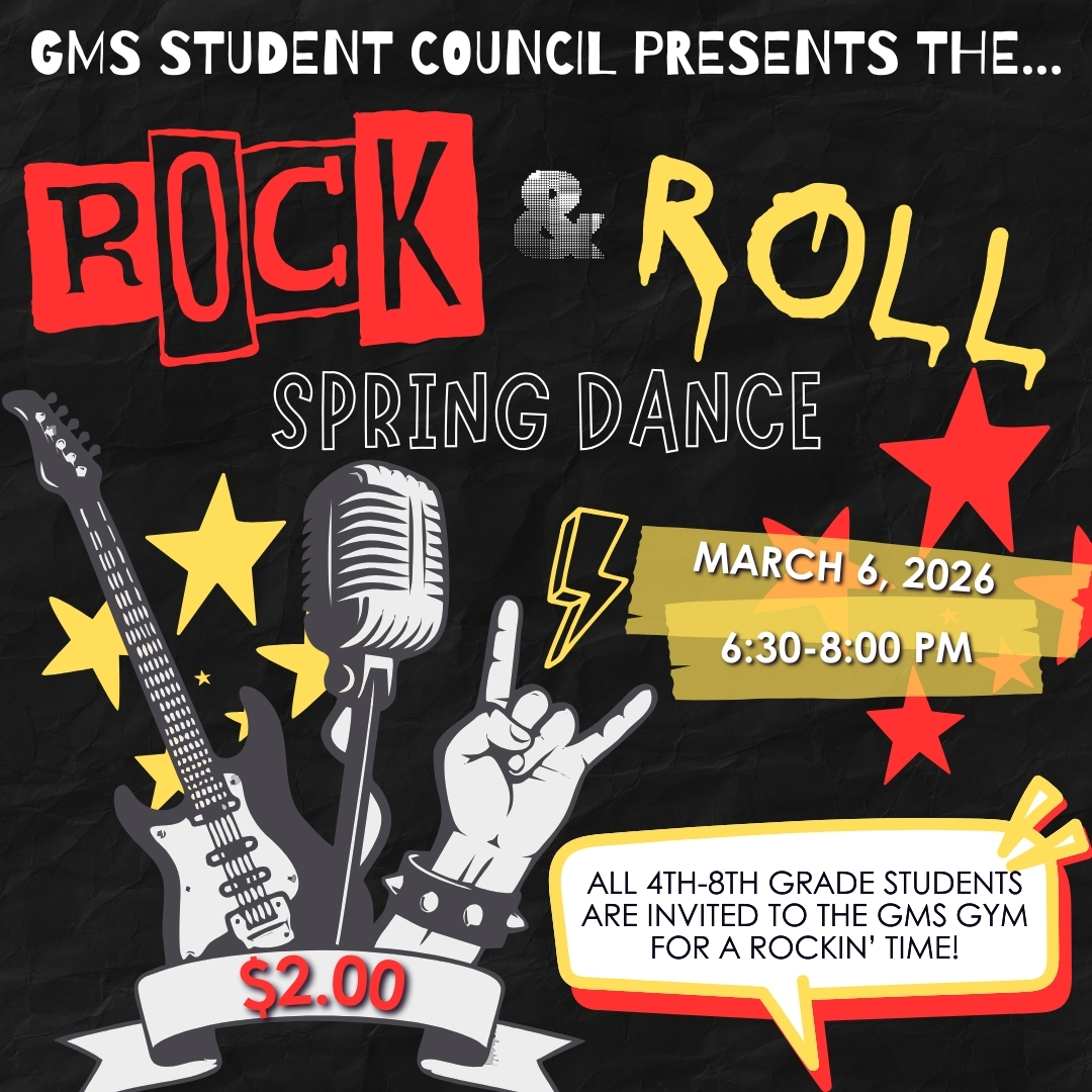 - Are you ready to rock?! It's time to mark your calendars and grab your best rock & roll attire… GMS Student Council will be hosting our annual spring dance on Friday, March 6th from 6:30-8:00 pm. There will be a DJ, limited concessions for purchase, and an hour and a half of music-filled fun! Admission is $2.00. All 4th through 8th grade students are invited to attend and have a rockin' time!!! We hope to see you there!